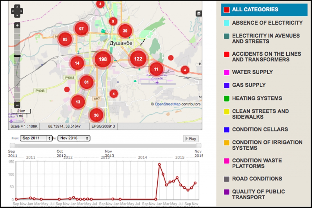 Goals and objectives: The joint innovative solution of the local government (municipality) of Dushanbe city and the Public Fund Civil Internet Policy Initiative aims to improve the quality of municipal service delivery through participation of inhabitants in reporting and mapping municipal services problems and monitoring their improvement through an online interactive platform. The platform, officially launched on 1 February 2012, is available at http://www.mometavonem.tj/php/?l=en_US