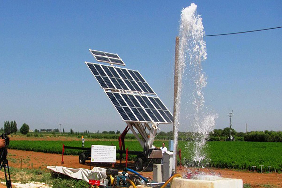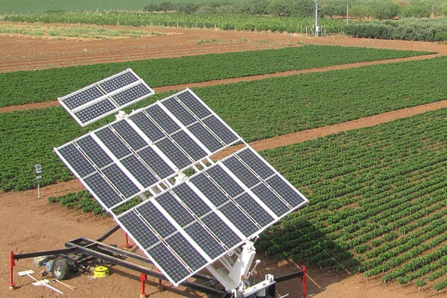 The system sets an example to the utilization of environmental friendly renewable energy resources through integration with modern agricultural irrigation systems. In contrast to the conventional PV- supported systems this machine is mobile. It tracks the sun automatically in two axes and has a self-cleaner unit.